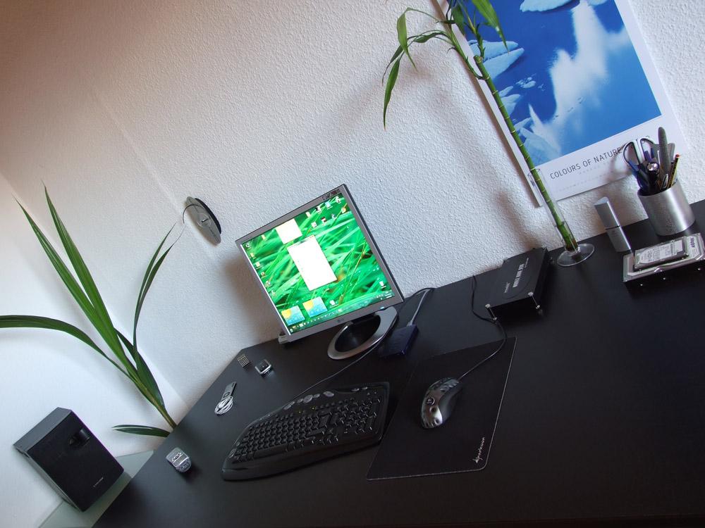 Als Basis dient ein Ikea Galant Schreibtisch in dessen Mitte ein 19″ TFT von LG plaziert ist. Und ja, das ist kein 16:9 Format – ganz Old School. Als Maus dient eine MX 518 und als Tastatur die Media Elite von Logitech. Diese Matte unter der Maus ist ein Sharkoon Gamer Pad, auch wenn ich nicht mehr viel am PC Zocke ist dass Pad einfach super.