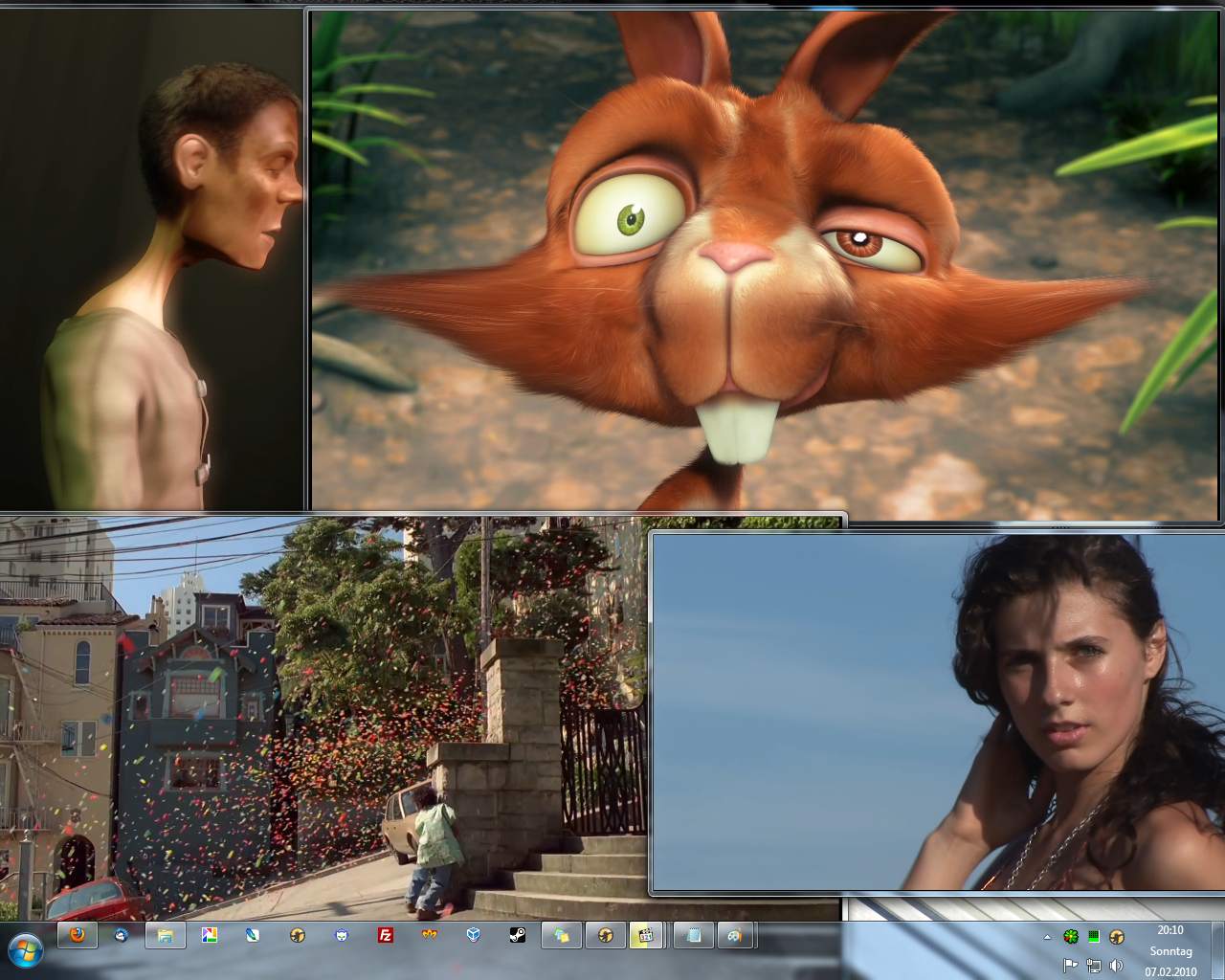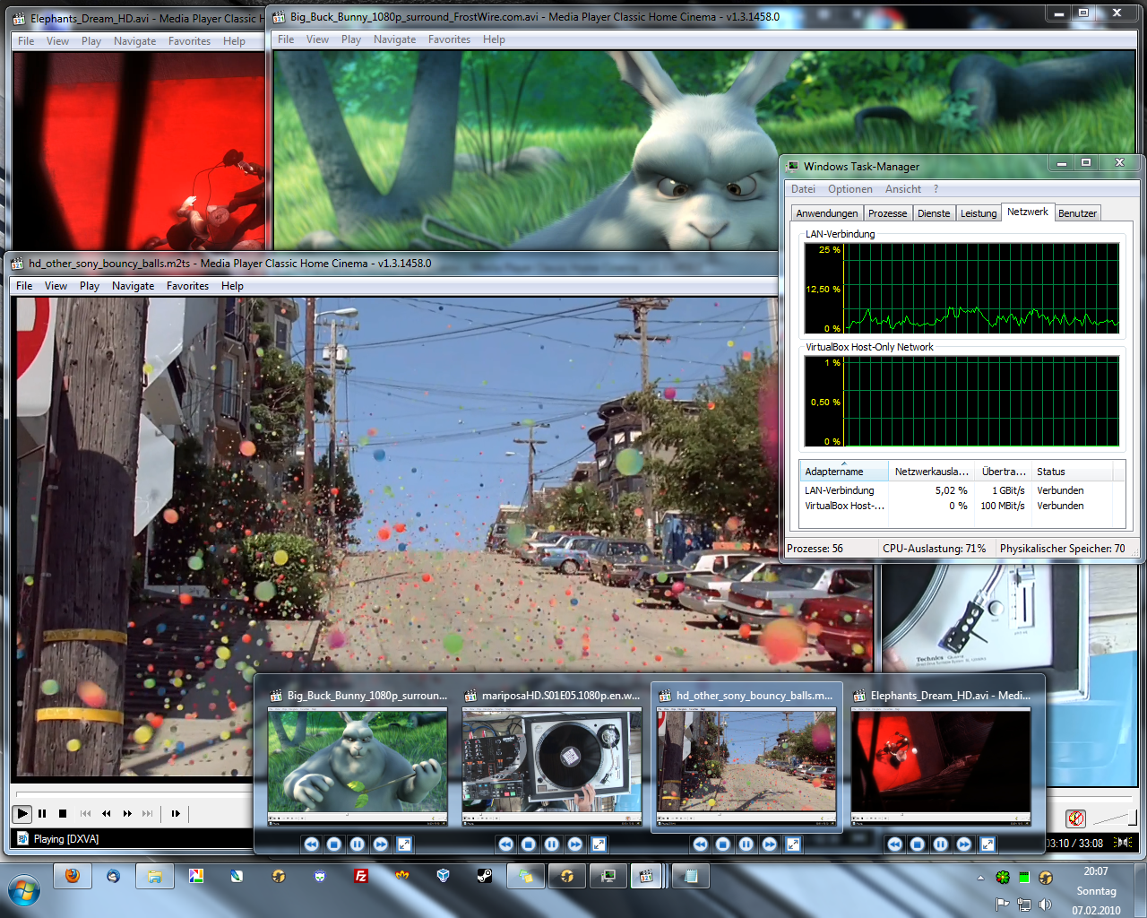 Ich habe mein ReadyNAS DUO 2000 einem „kleinen“ Stresstest unterzogen. Und zwar habe ich die folgenden vier 1080p (Full HD) Videos zur gleichzeitig direkt vom NAS gestartet und somit gestreamt. Auch wenn das NAS Gigabit Netzwerk unterstützt liefen die Daten zuerst über die FritzBox (100Mbit/s), einen 100Mbit/s und einen 1000Mbit“s D-Link Switch zu meinem Rechner.