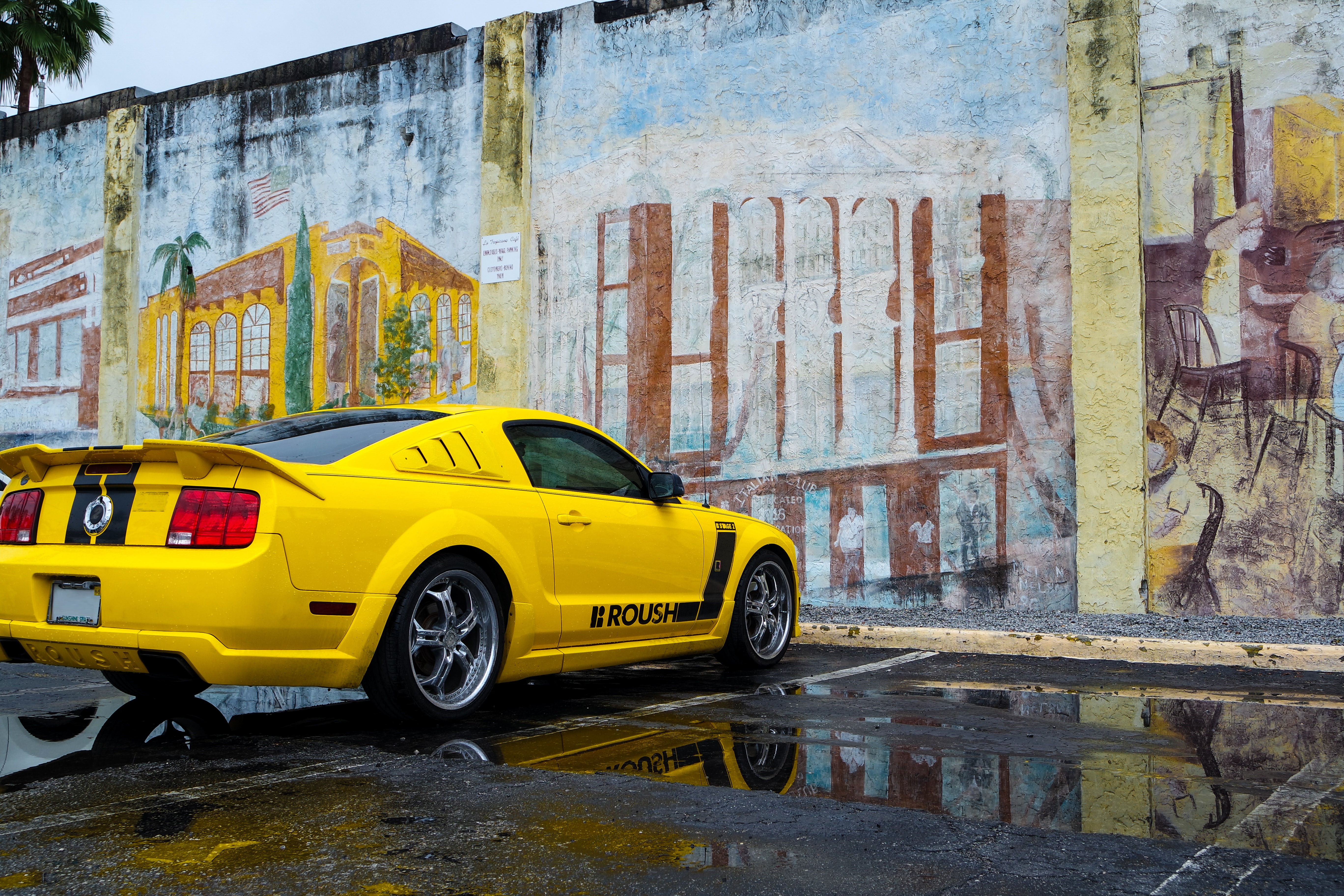 Auf dem Weg von Orlando nach St. Petersburg im Westen liegt Tampa und der historische Stadtteil Ybor City, der für seine zahlreichen Zigarrenmanufakturen bekannt ist. Es hatte gerade aufgehört zu regnen als wir den Parkplatz erreichten, da sah ich auf dem Parkplatz des La Tropicana Cafe nebenan diesen geilen Mustang vor dieser bemalten alten Wand stehen.